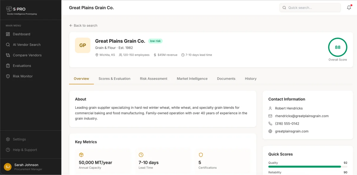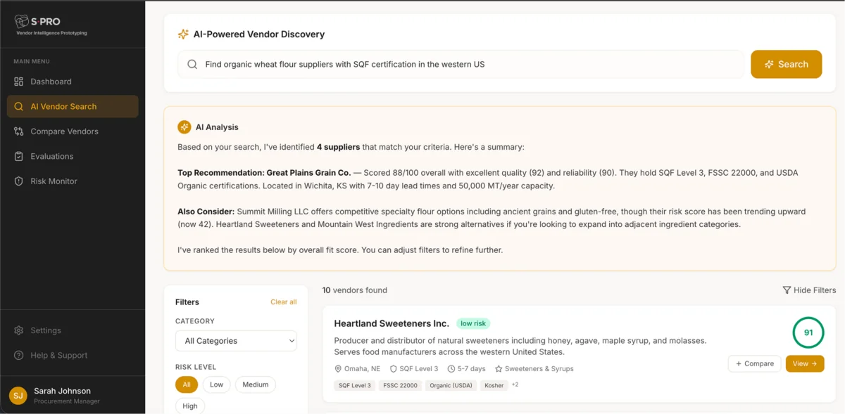 The platform allows users to search for suppliers using natural language queries such as “organic wheat suppliers”. The system returns structured vendor profiles with key data like certifications, capacity, lead times, location, and risk indicators.