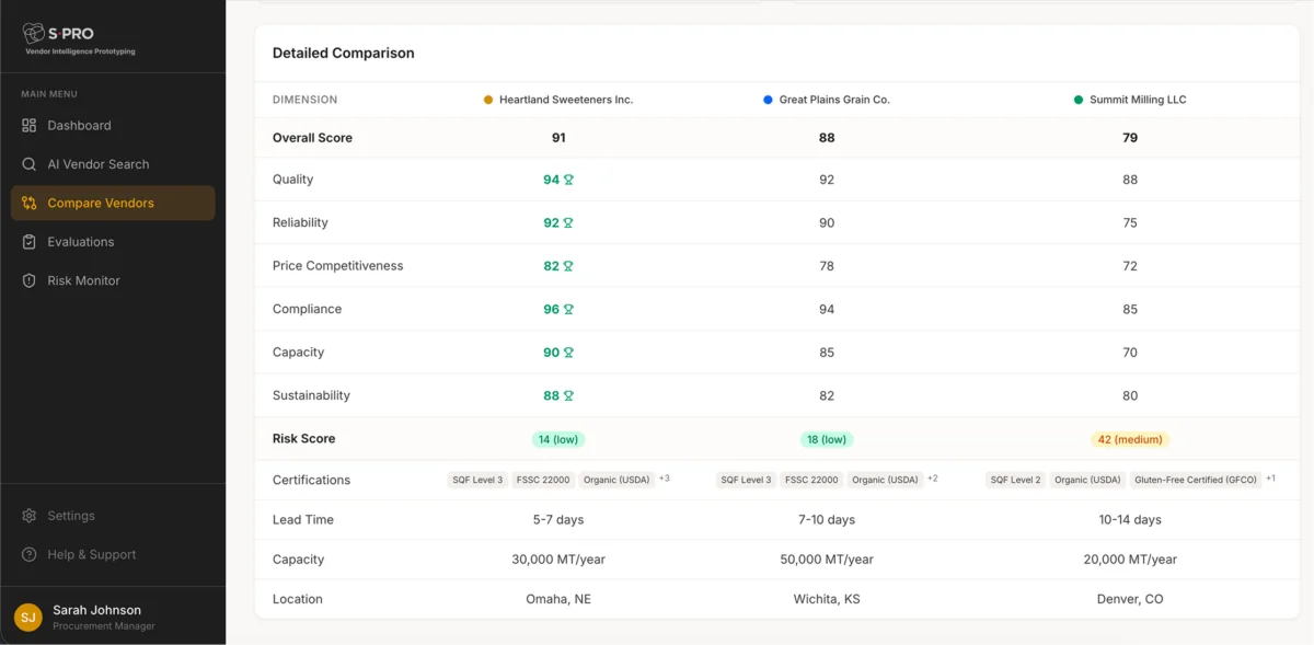 Users can then select multiple vendors and generate an AI-assisted comparison, showing differences across quality, reliability, price competitiveness, sustainability, compliance, and capacity. Visual score overlays and comparison tables help teams quickly see which supplier best matches their criteria.